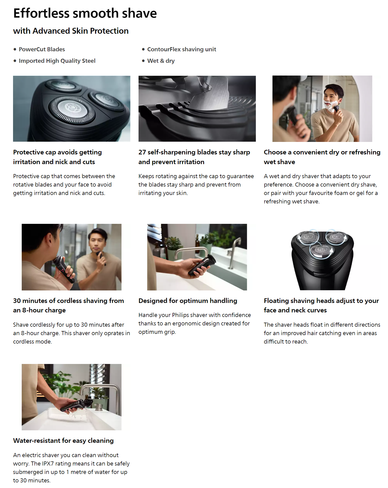 The new affordable shaver Series 1000 by Philips gives you effortless smooth shave with advanced skin protection. High quality self-sharpening blades and flex heads that move in 3 directions ensure you get an enjoyable shaving experience.