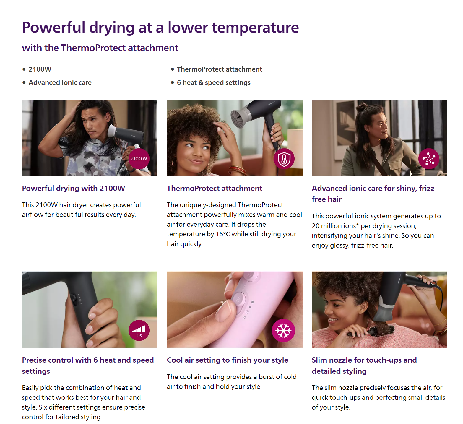 The uniquely-designed ThermoProtect attachement powerfully mixes warm and cool air for everyday care.