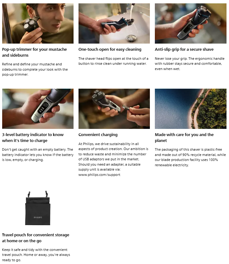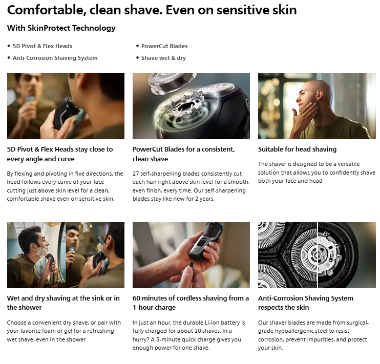 Philips Shaver 3000 Series Wet & Dry Electric Shaver gives you a comfortable, clean shave, even on sensitive skin. 5D Pivot & Flex Heads, 27 self-sharpening PowerCut Blades, and wet and dry use ensure excellent, reliable results every time.