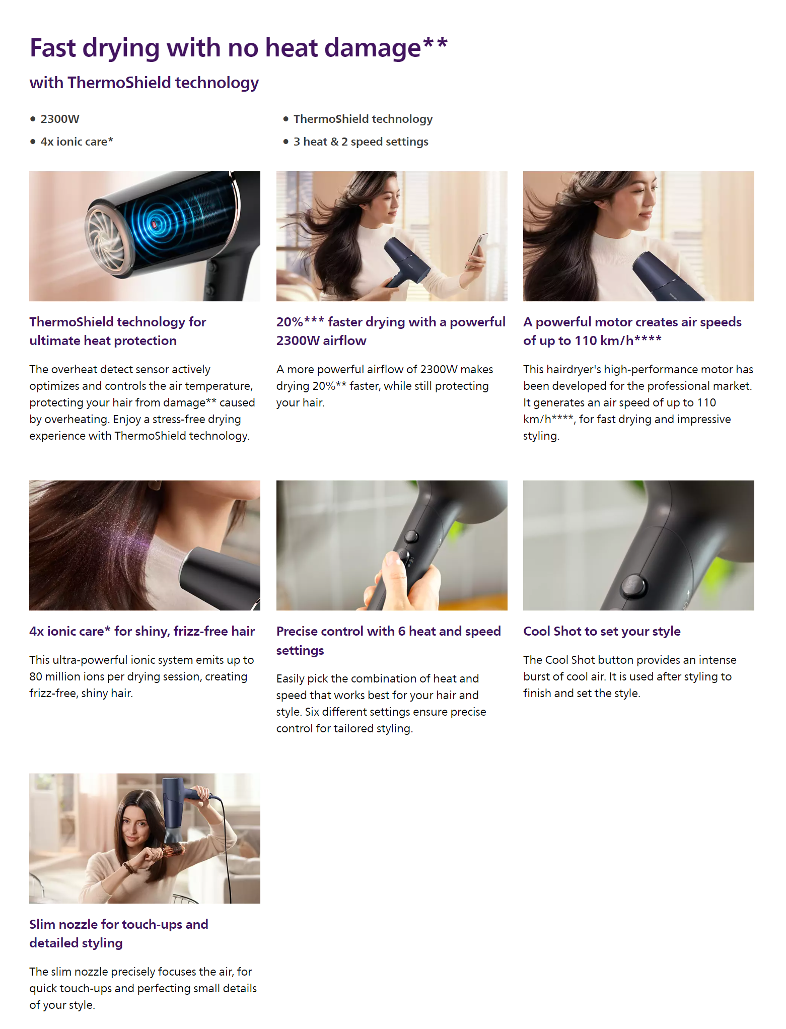 *vs. BHD350 in top setting** ThermoShield setting*** vs. basic dryer**** Tested in Philips lab with nozzle in top setting