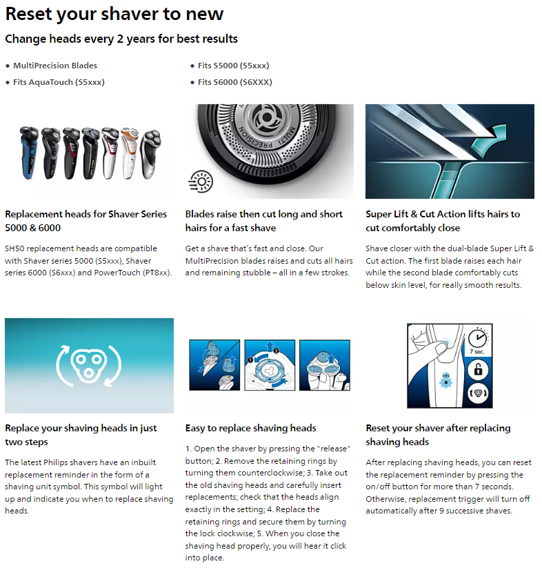 Change heads every 2 years for the best results Within two years your shaver heads cut 9 million hairs on your face. Replace the shaver heads and get back to 100% performance. Compatible with the Series 5000, 6000 and AquaTouch Shaver.