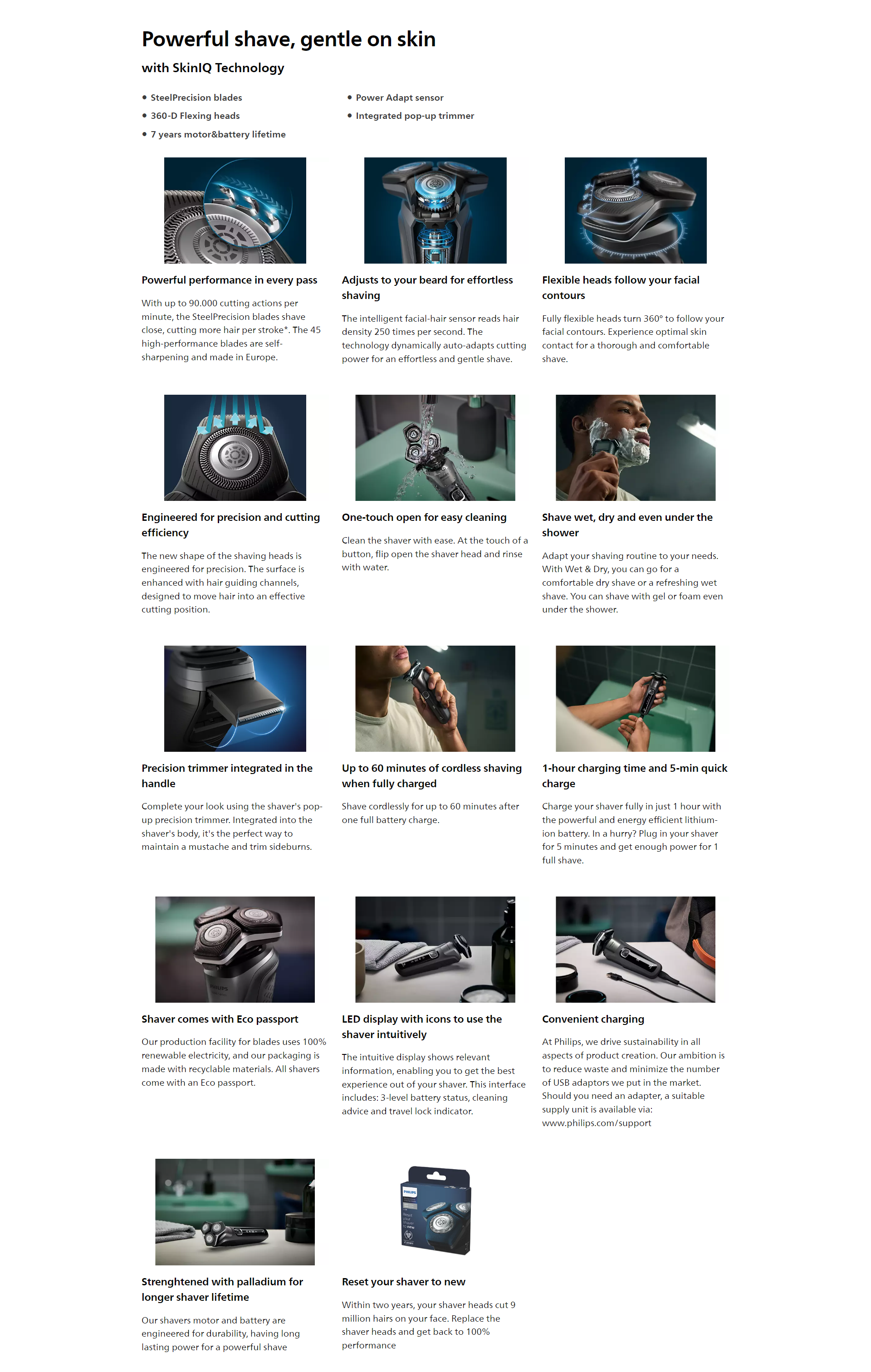 The Philips Series 5000 delivers a powerful shave, cutting now even more hair per stroke*. Equipped with advanced SkinIQ technology, the shaver senses and adapts to your hair density, for improved skin comfort.