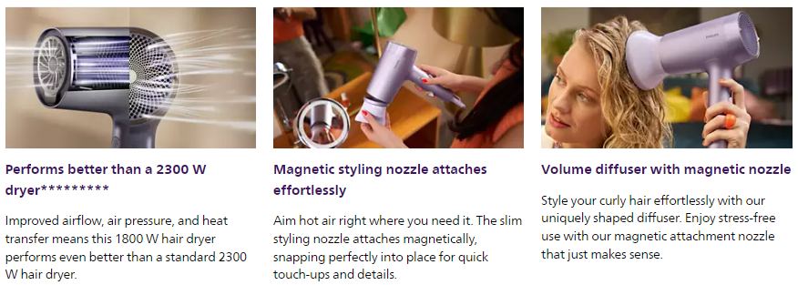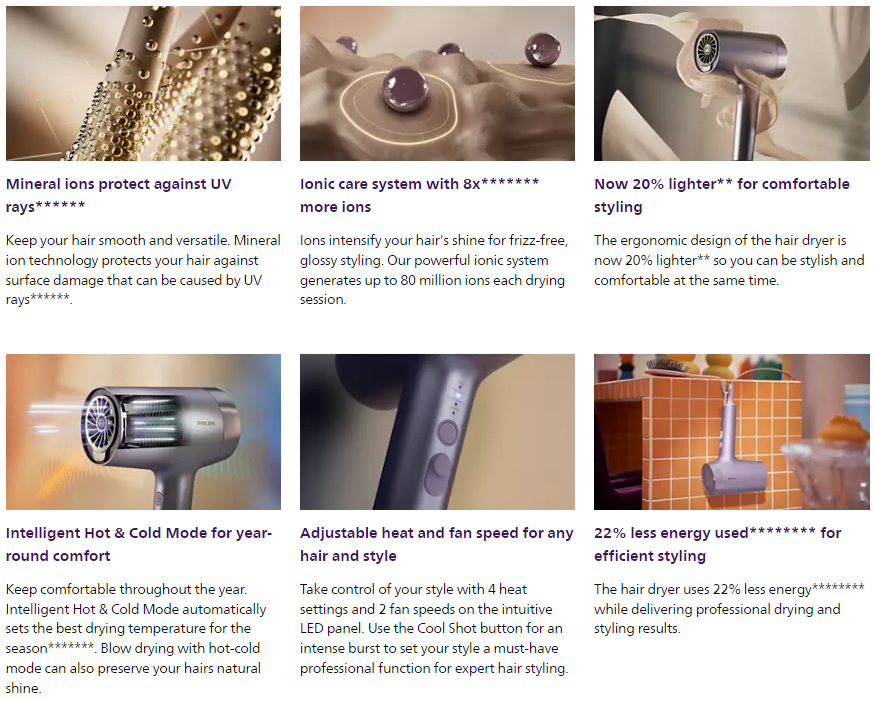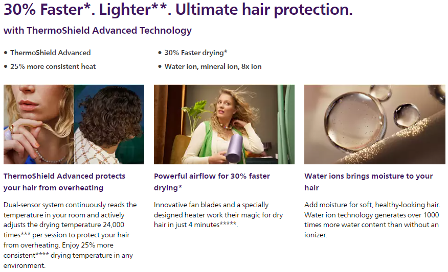 Philips 7000 Series Hair Dryer delivers professional results fast. Millions of ions intensify your hair's shine, while ThermoShield Advanced Technology senses temperature to protect hair from overheating.
