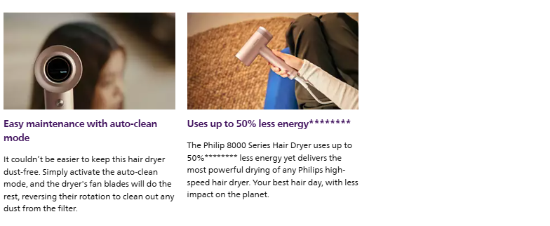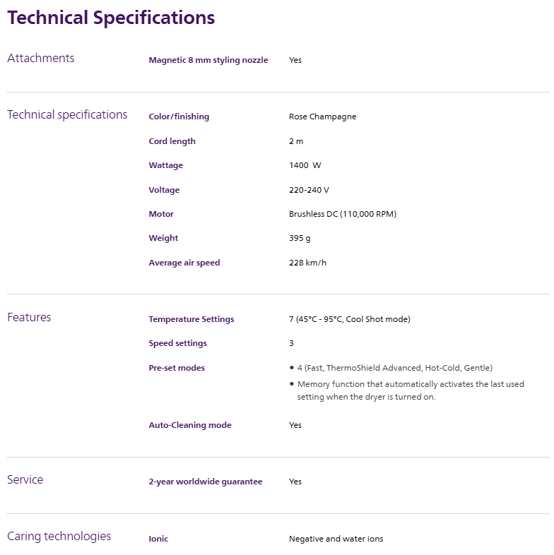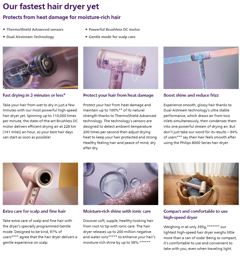 *Tested on 30 cm long Caucasian hair using the highest heat and speed setting** Tested at Thermoshield mode vs air dry*** Tested with 31 users under Hot/Cold mode**** Tested with 31 users under Hot/Cold mode***** Tested under highest heat and speed setting****** Tested under Hot/Cold mode, vs air dry******* Without cord and accessories******** Versus Philips BHD530 with 2300W, tested under highest heat and speed setting