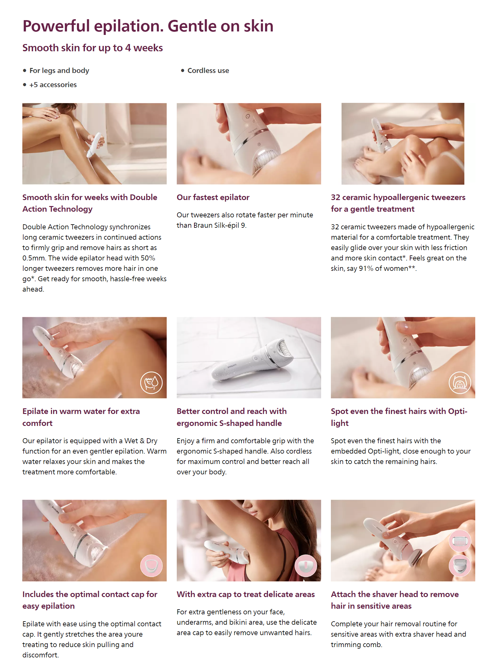 Philips Epilator Series 8000 boasts powerful yet gentle epilation so you can achieve smoothness on your both lower legs in as little as 10 minutes. Enjoy benefits beyond just epilation with extra accessories.
