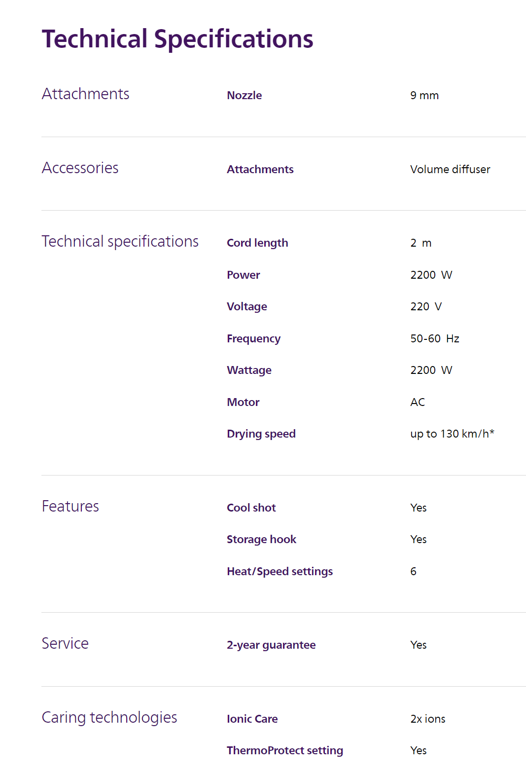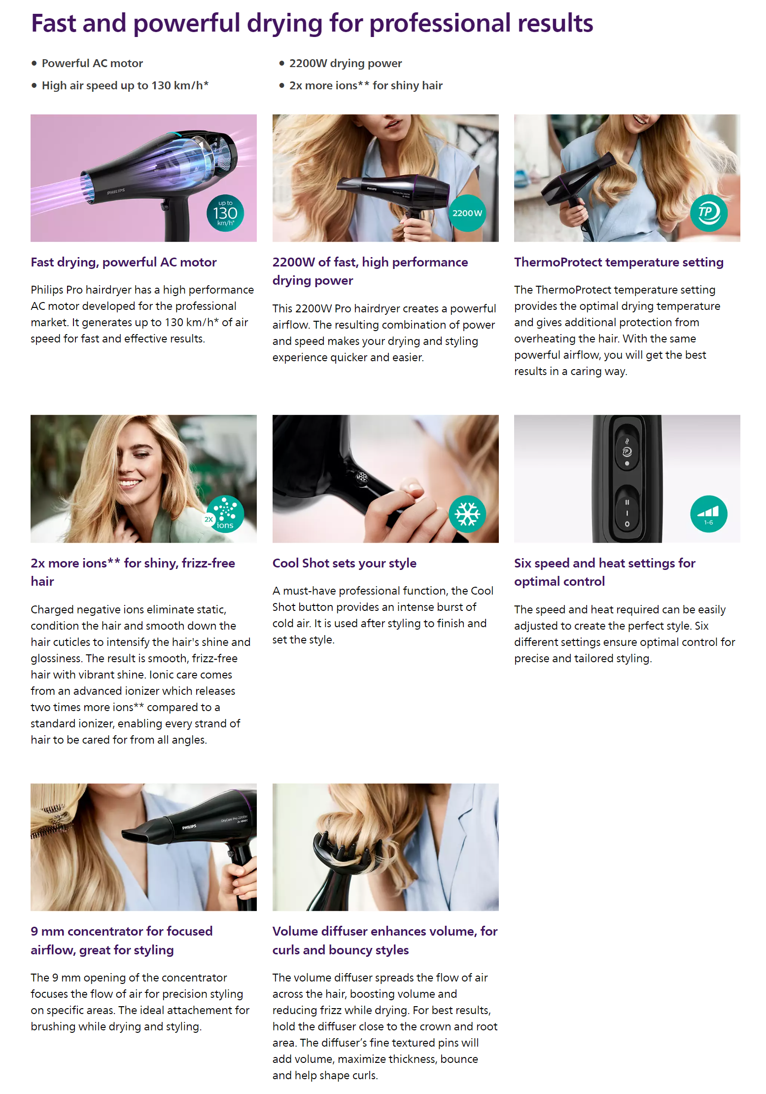 Philips Pro hairdryer has a professional AC motor that reaches up to 130 km/h* of air speed for fast and professional results. It also features the ThermoProtect setting for optimal temperature to protect from overheating.