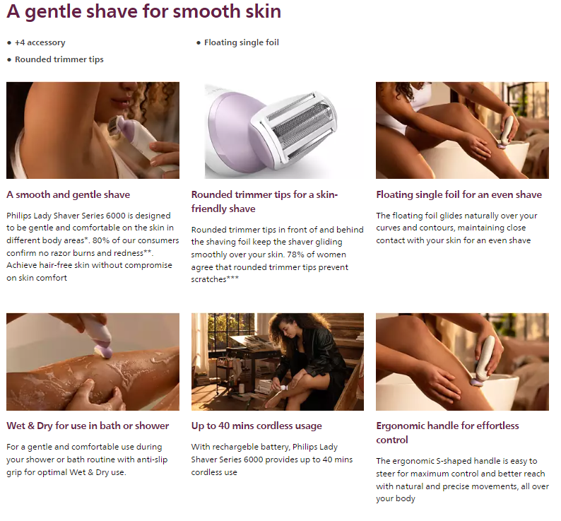 Experience smooth shave all over your body. The convenient and easy-to-use Philips Lady Shaver Series 6000 is suitable for sensitive areas and provides effortless smoothness while caring for your delicate skin.