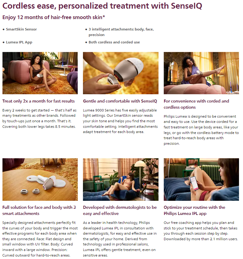 Enjoy hassle-free, personalized treatment with the cordless version of our fastest Lumea IPL device. SenseIQ technology with smart attachments and guidance in the Lumea IPL app to give you long-lasting smooth skin.