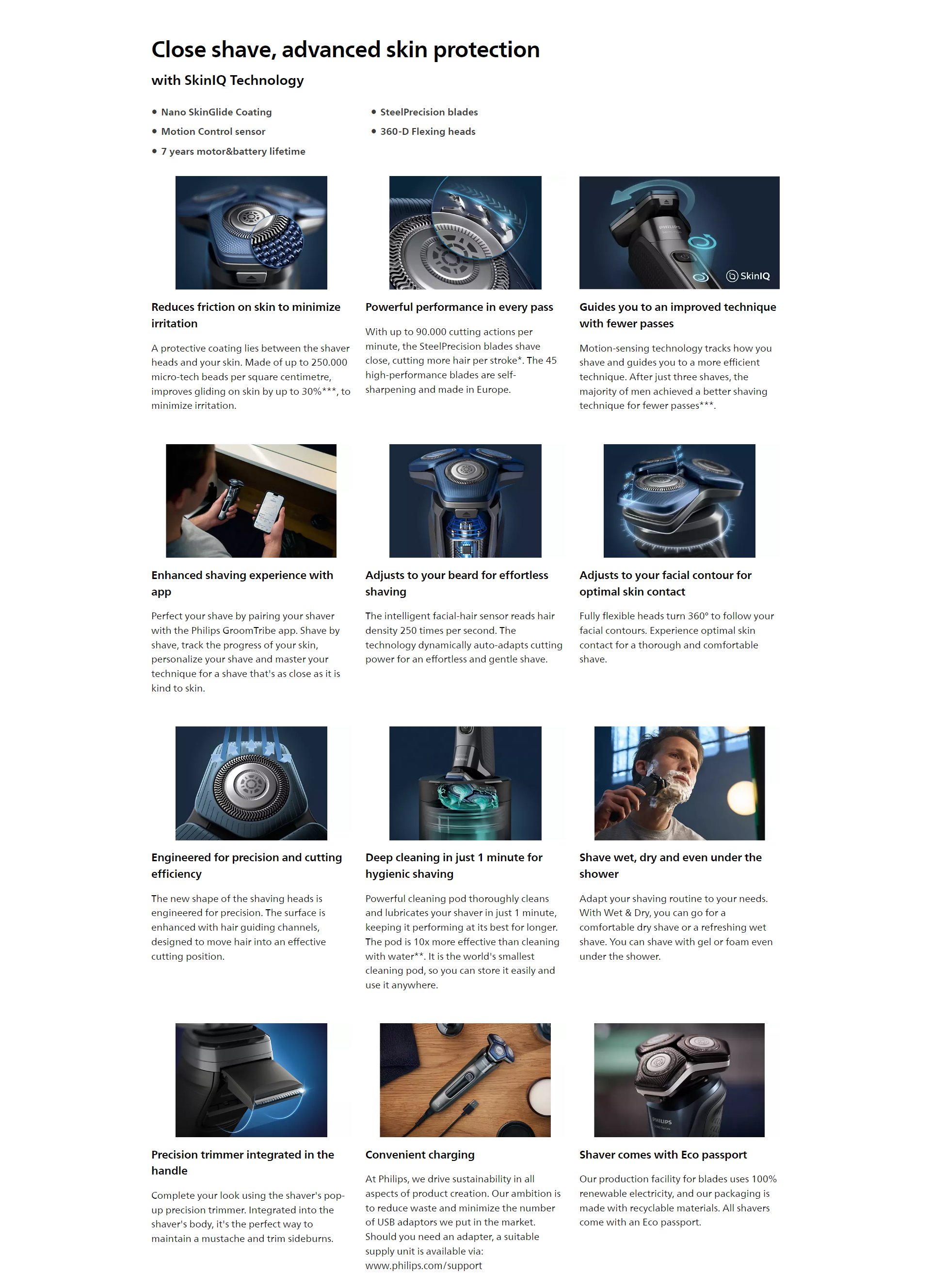 The Philips Series 7000 glides smoothly over your skin, while cutting each hair close - even on 3-day beards. Equipped with advanced SkinIQ technology, the shaver senses, adapts and guides on the correct motion, for better skin protection.