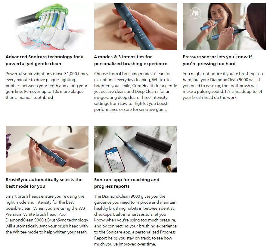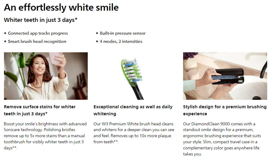 Start every day in style with advanced Sonicare technology for whiter teeth and oral health. Gentle on gums with a connected app for coaching and tracking. Choose from 4 modes and 3 intensities for a personalized brushing experience.