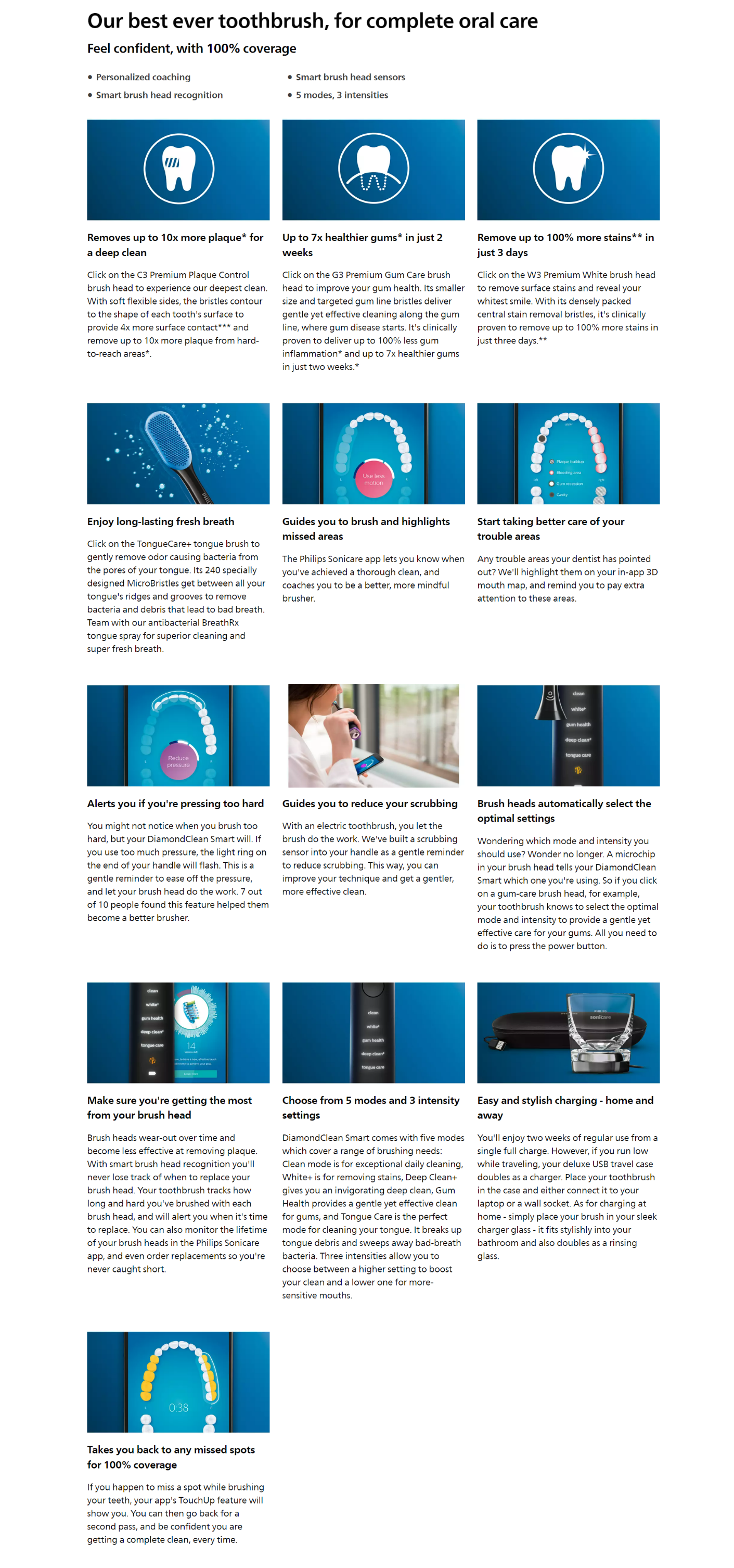 The DiamondClean Smart is our best toothbrush, for complete care. Four high performance brush heads let you focus on all areas of your oral health, and our Smart