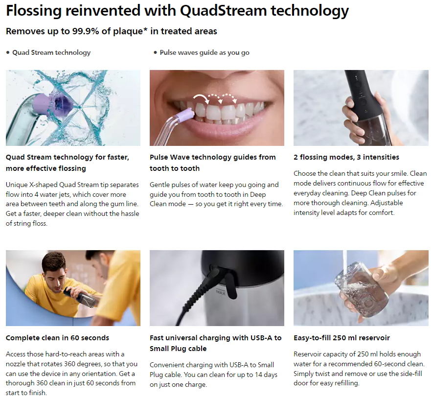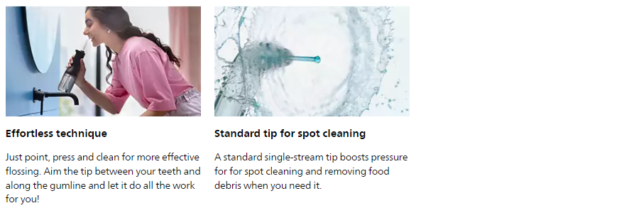 Effortlessly thorough cleaning between teeth to improve your gum health. Unique Quad Stream tip cleans more area with less effort for more effective flossing every time, so it's easy to get flossing right.