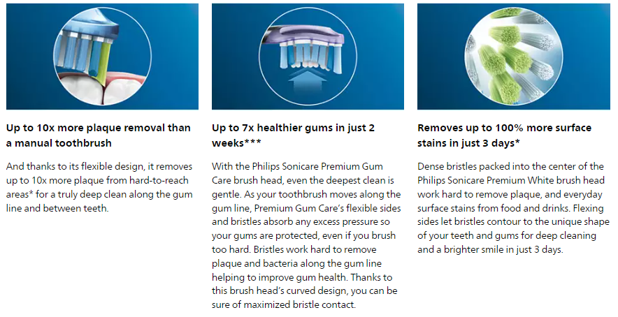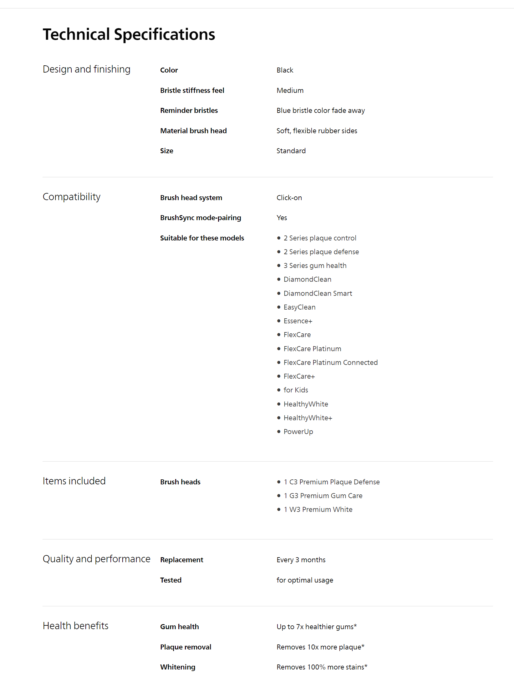 C3 Premium Plaque Defense brush head provides up to 10X more plaque removal* for great results. G3 Premium Gum Care provides 7X healthier gums in just two weeks*** & W3 Premium White removes 100% more stains in 3 days*