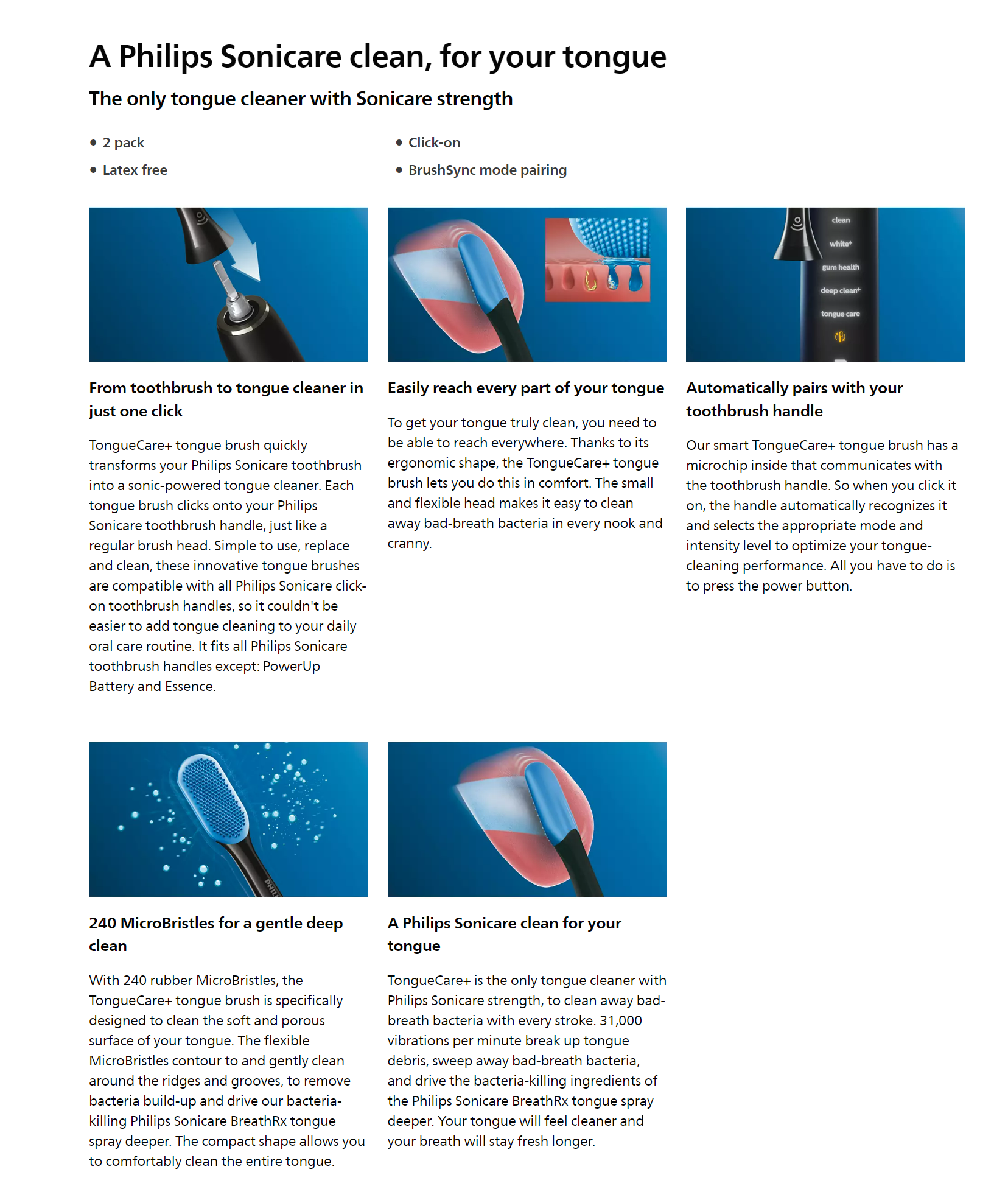 Transform a Philips Sonicare toothbrush into a sonic-powered tongue cleaner. With specially designed MicroBristles, our smart TongueCare+ tongue brush deep cleans your tongue when paired with Philip Sonicare BreathRx tongue spray.