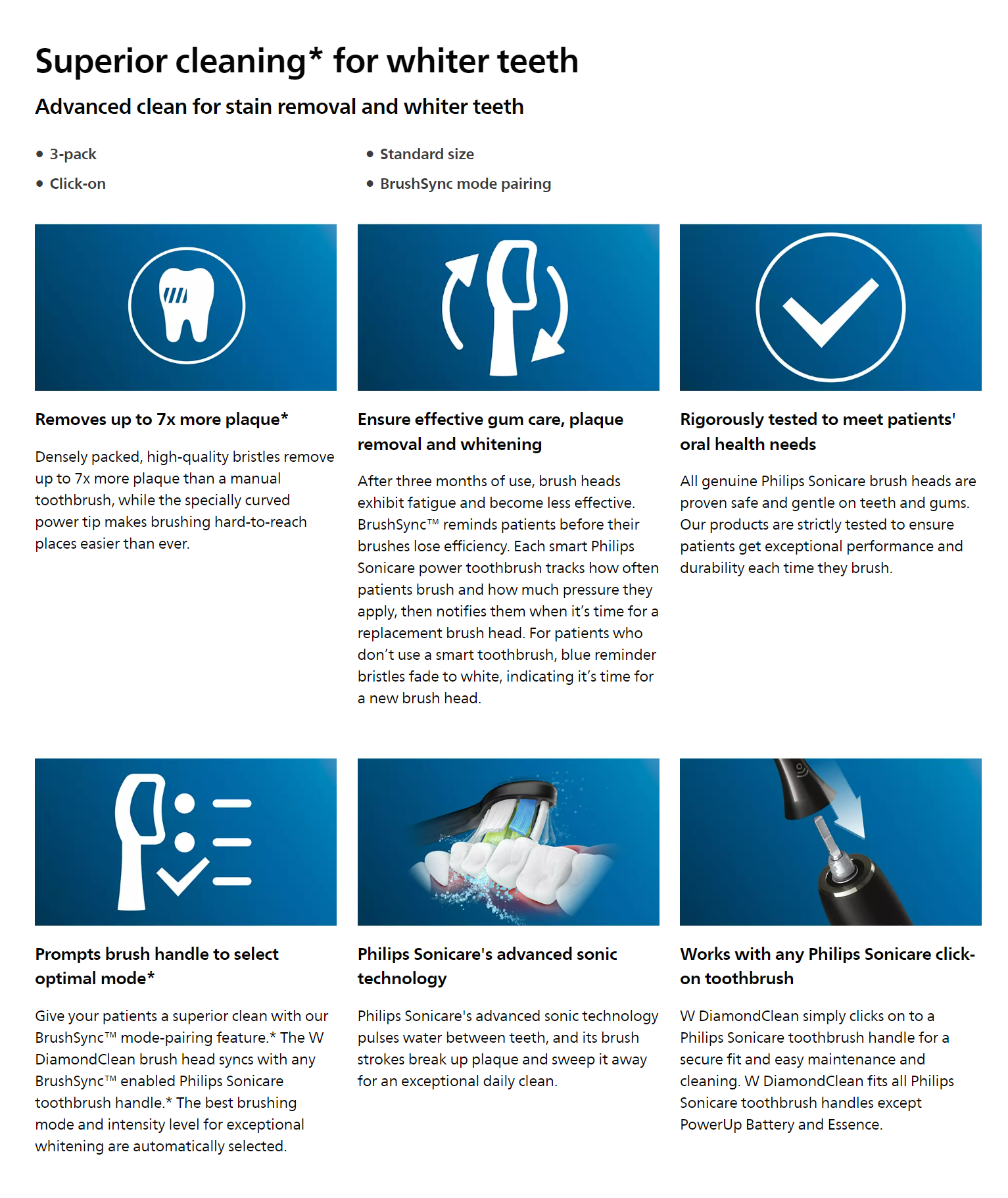 Philips Sonicare W2 DiamondClean brush heads remove up to 100% more stains vs. a manual toothbrush for whiter teeth in just one week. Clinically proven to remove up to 7x more plaque vs. a manual after four weeks of use.