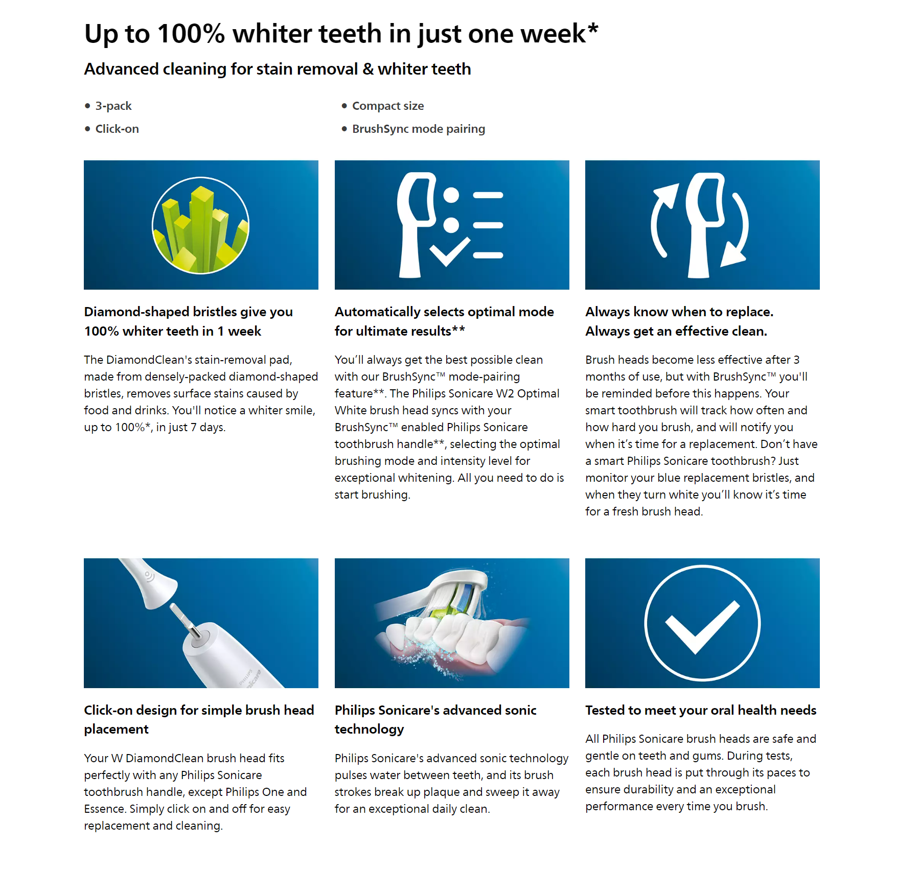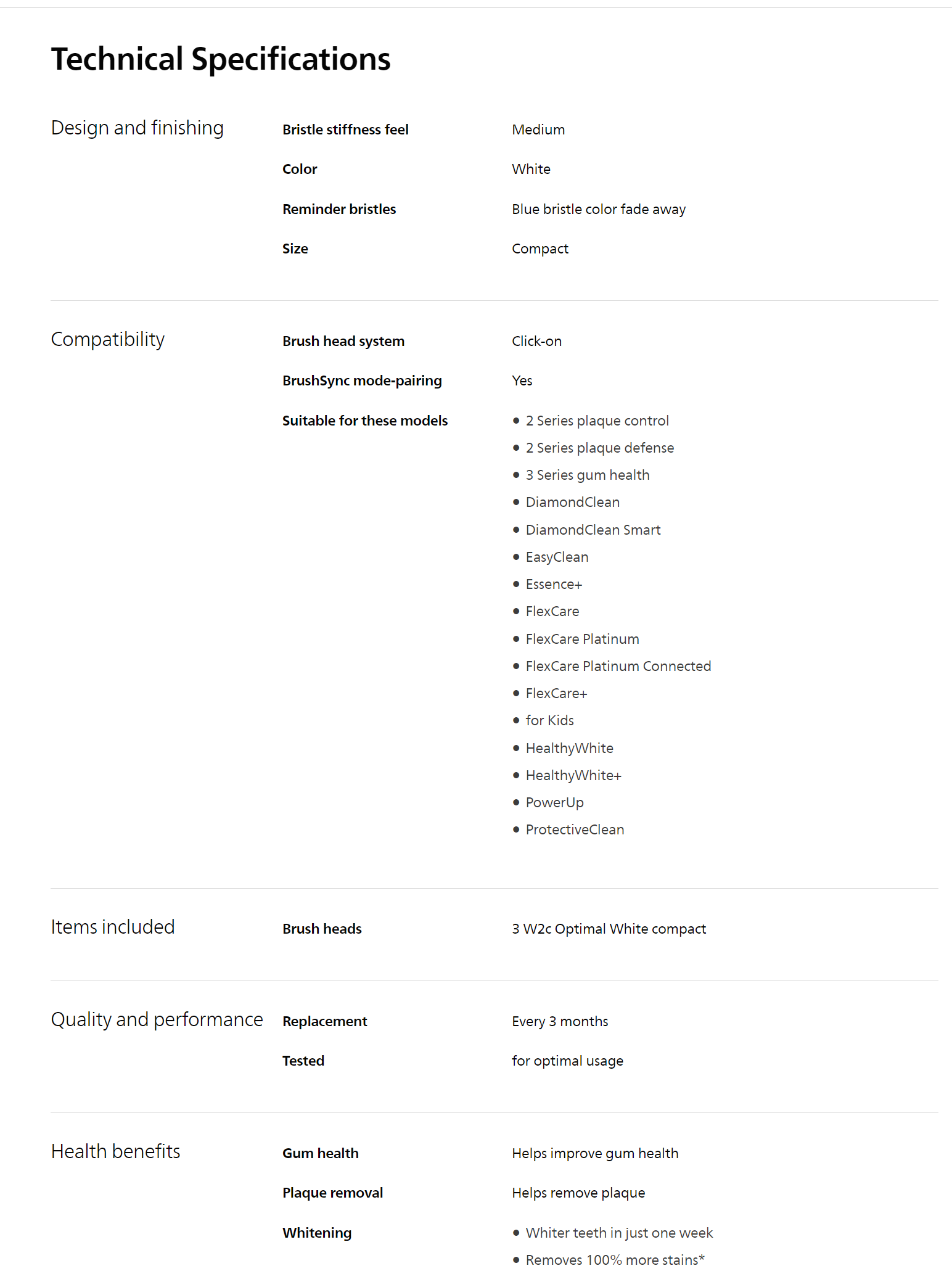 The W2c Optimal White brush head is perfect for those who want to go beyond deep cleaning to remove surface stains for a radiant, white smile.This brush head is also great for maintaining brightness between professional whitening treatments