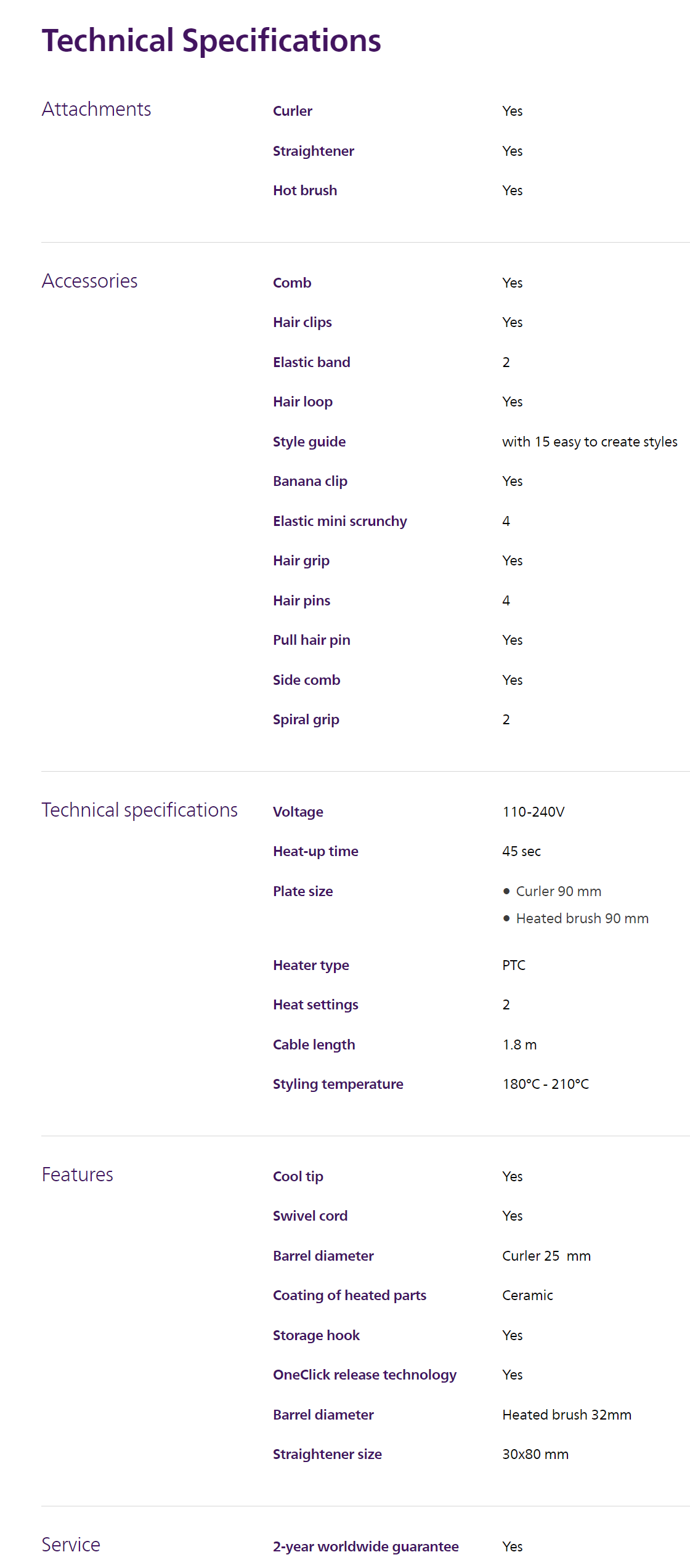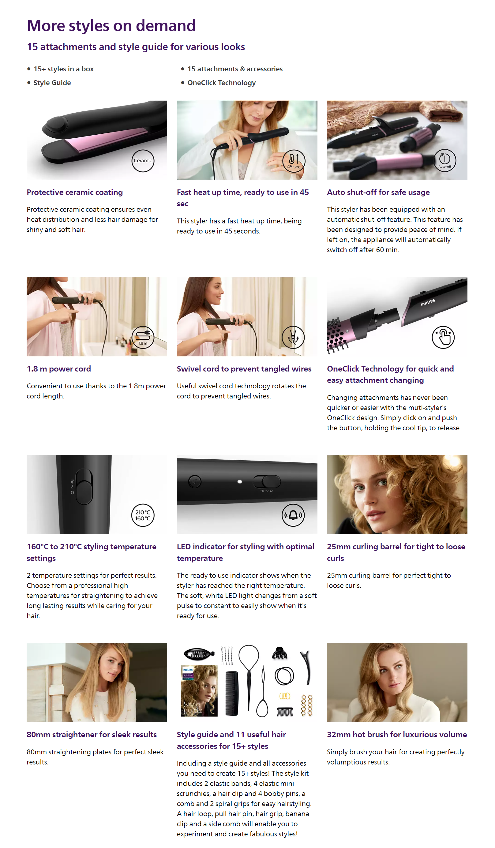 Every day a different look! From to perfectly polished, straight, volumized, curly hair to updos and more, create more than 15 styles with the new Philips Multi-Styler with style guide.