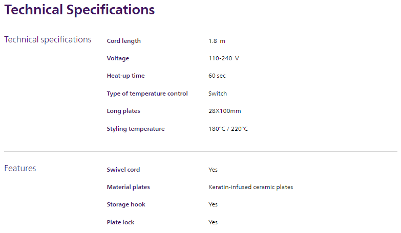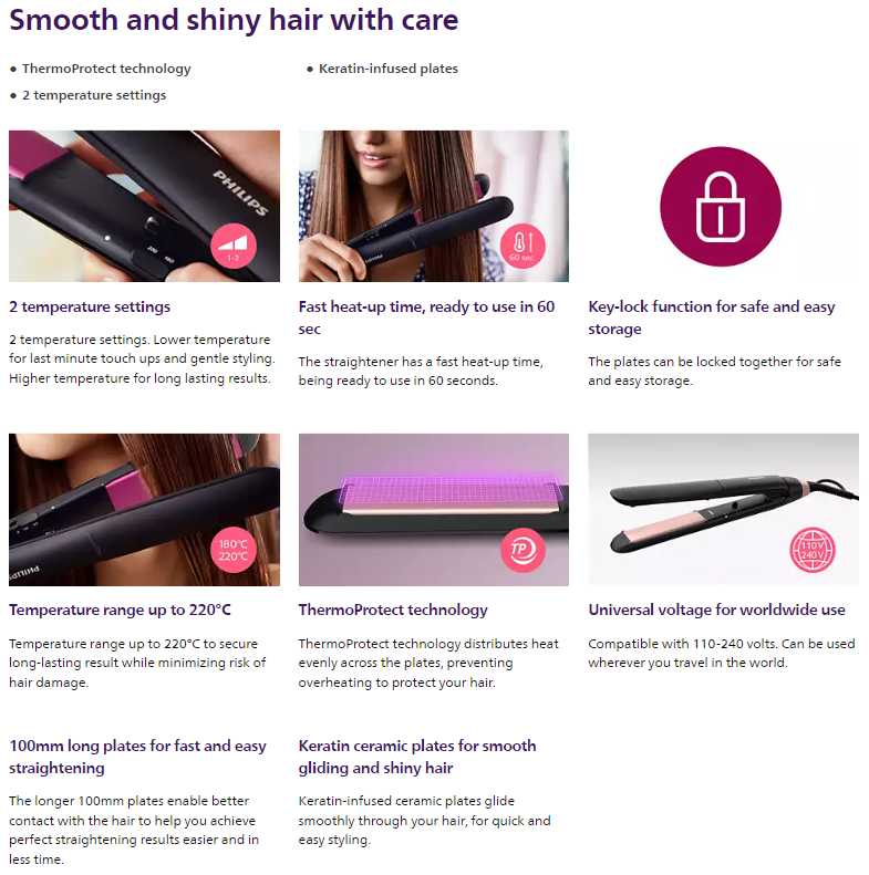 Specially designed for easy and fast styling with long Keratin-infused plates and 2 temperature settings. Care for your hair with ThermoProtect technology preventing overheating.