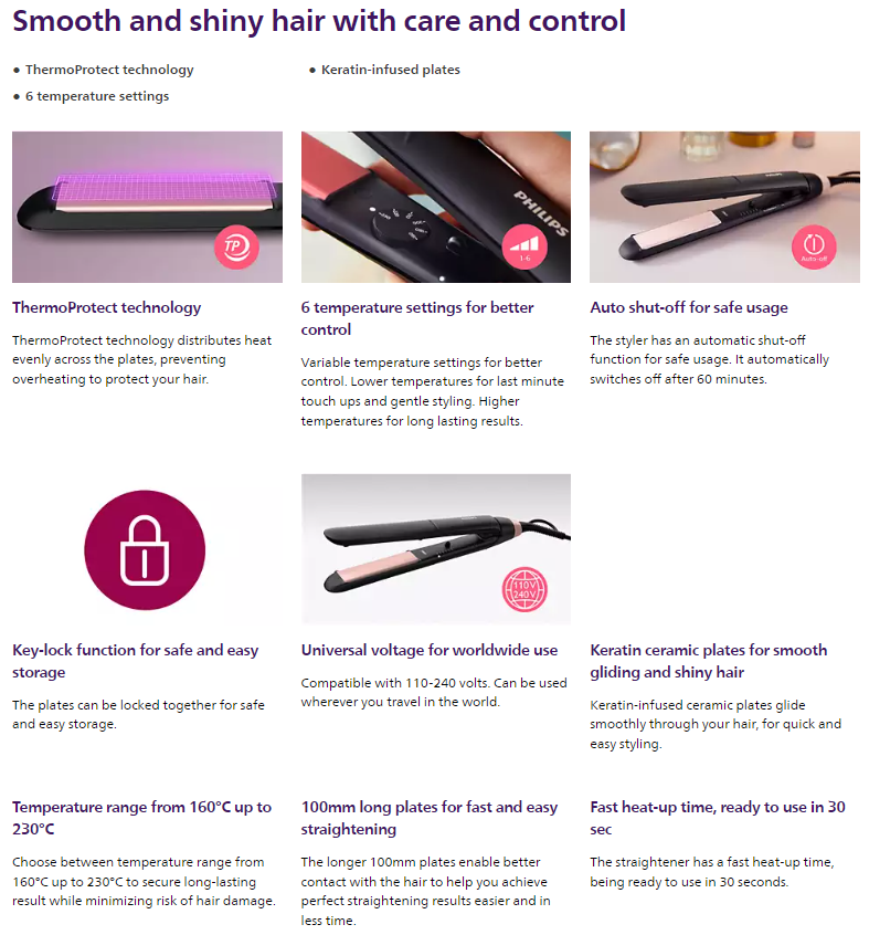 Specially designed for easy and fast styling with long Keratin-infused plates and 6 temperature settings. Care for your hair with ThermoProtect technology preventing overheating.
