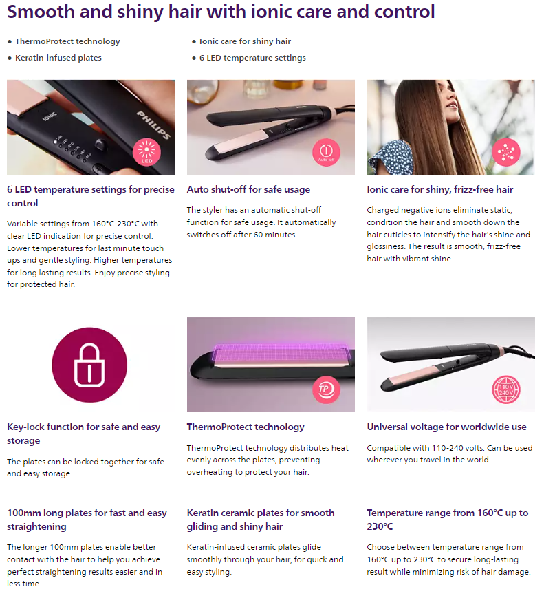 Specially designed for easy and fast styling with long Keratin-infused plates and 6 LED temperature settings. Care for your hair with ThermoProtect technology preventing overheating and to give your hair vibrant shine with ions.