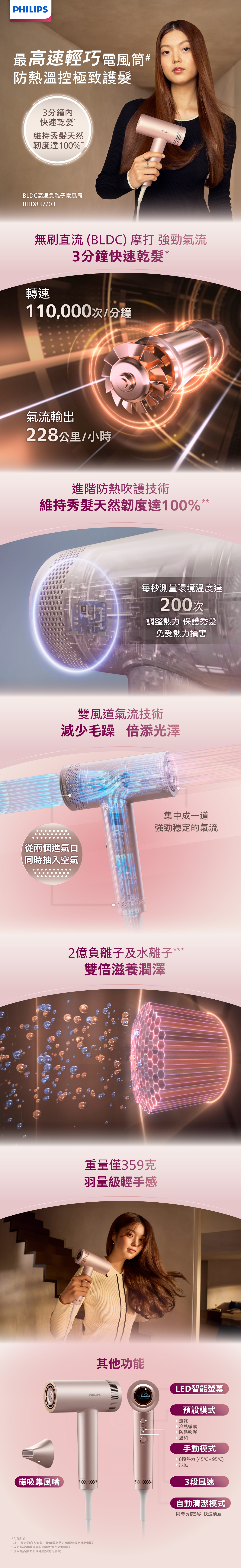 隆重介紹 Philips 8000 系列電風筒。我們最輕巧的高速負離子電風筒,配備進階防熱吹護溫度感應器,旨在保護秀髮免受熱力損傷,帶來強韌、柔亮且潤澤的秀髮。