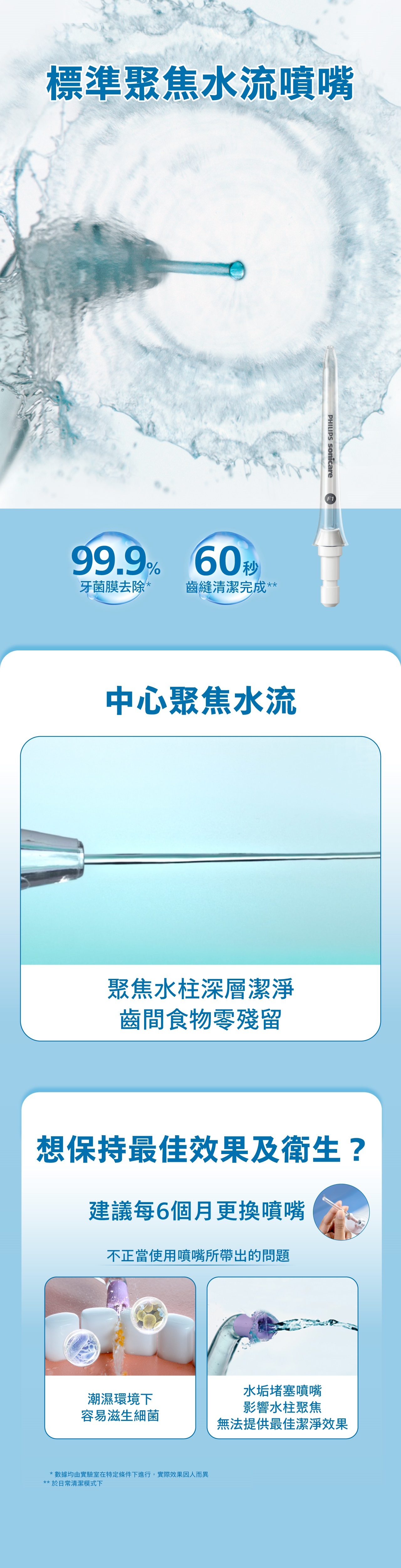使用標準噴嘴作日常清潔。噴嘴使用單一聚焦水流去除碎屑,徹底清潔牙縫。