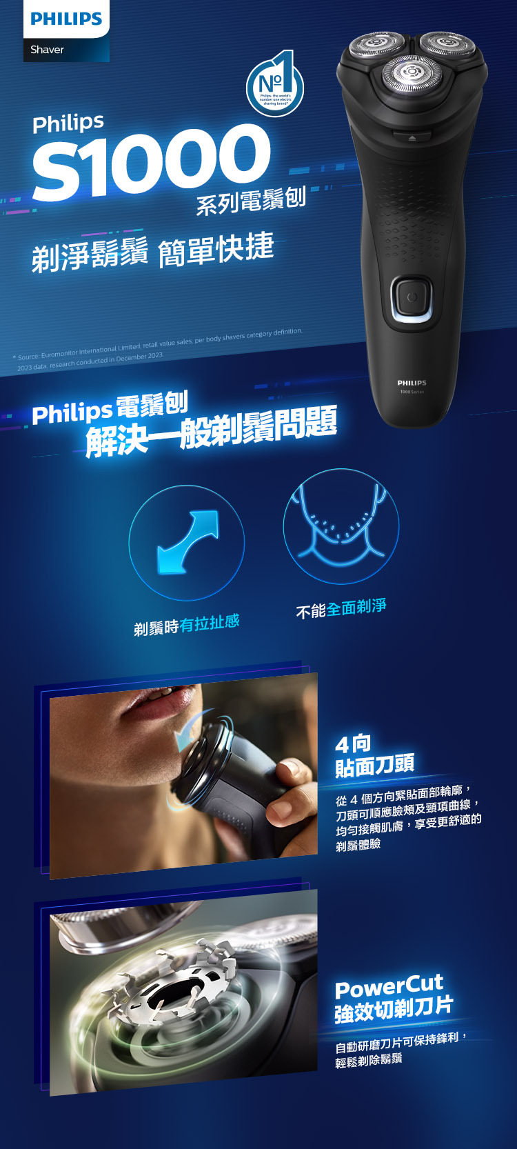 Philips 1000 系列電鬚刨屬入門級別,讓您享受方便快捷的剃鬚體驗。產品配備自動研磨 PowerCut 強效切剃刀片,緊貼皮膚表面剃除鬍鬚,機身具備防水功能,可容易清潔電鬚刨。