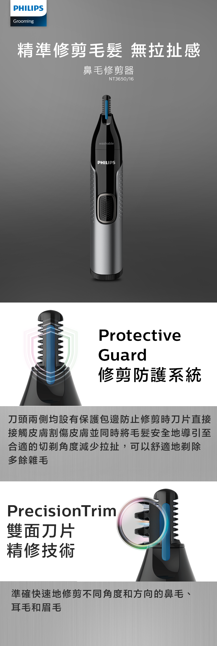 Philips 鼻毛修剪器 3000 系列可輕鬆修剪鼻毛、耳毛和眉毛。全新的 PrecisionTrim 精準修剪技術和 Protective Guard 防護系統經過精心設計,可確保輕鬆有效修剪雜毛,而且不會產生拉扯感。