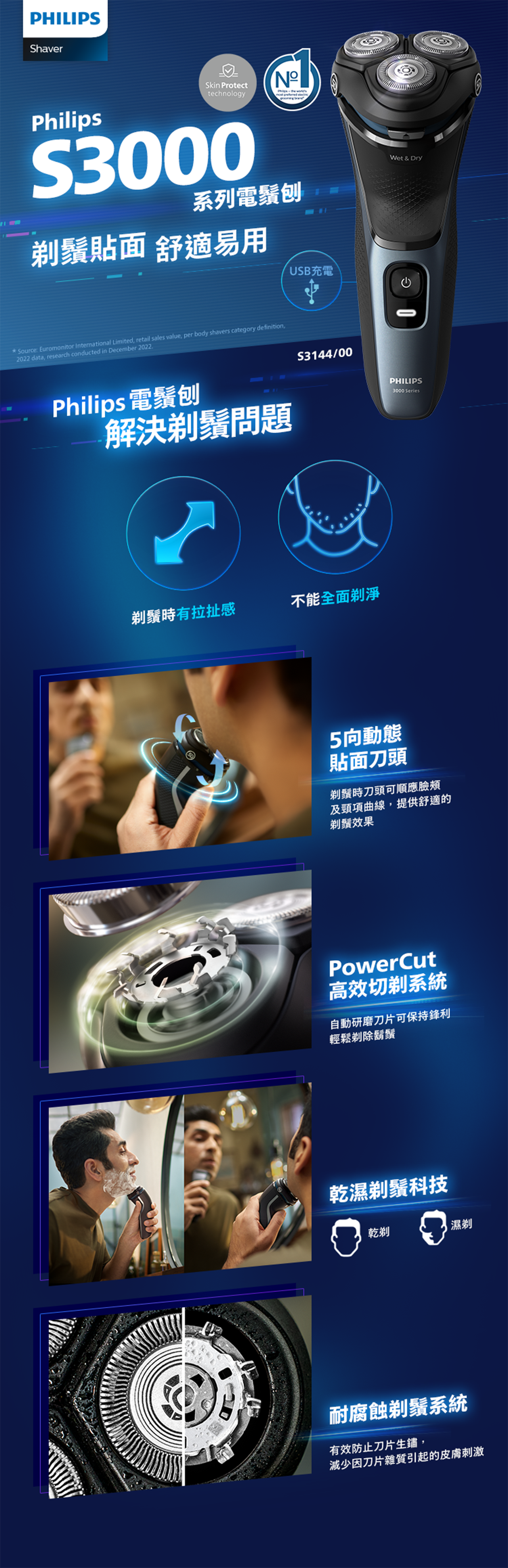 Philips 3000 系列乾濕兩用電鬚刨為您帶來舒適潔淨的剃鬚效果,即使是敏感皮膚都適用。5 向動態貼面刀頭、27 片自動研磨 PowerCut 強效切剃刀片及乾濕兩用效能,確保每次都能帶來出色可靠的剃鬚效果。