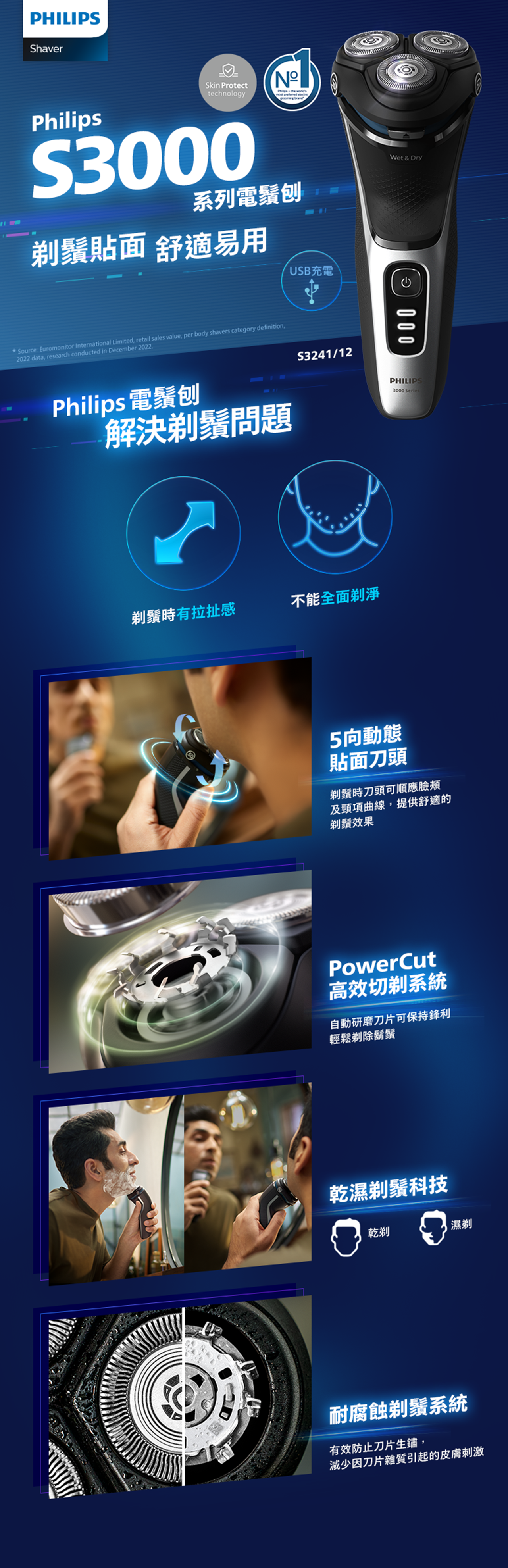 Philips 3000 系列乾濕兩用電鬚刨為您帶來舒適潔淨的剃鬚效果,即使是敏感皮膚都適用。5 向動態貼面刀頭、27 片自動研磨 PowerCut 強效切剃刀片及乾濕兩用效能,確保每次都能帶來出色可靠的剃鬚效果。