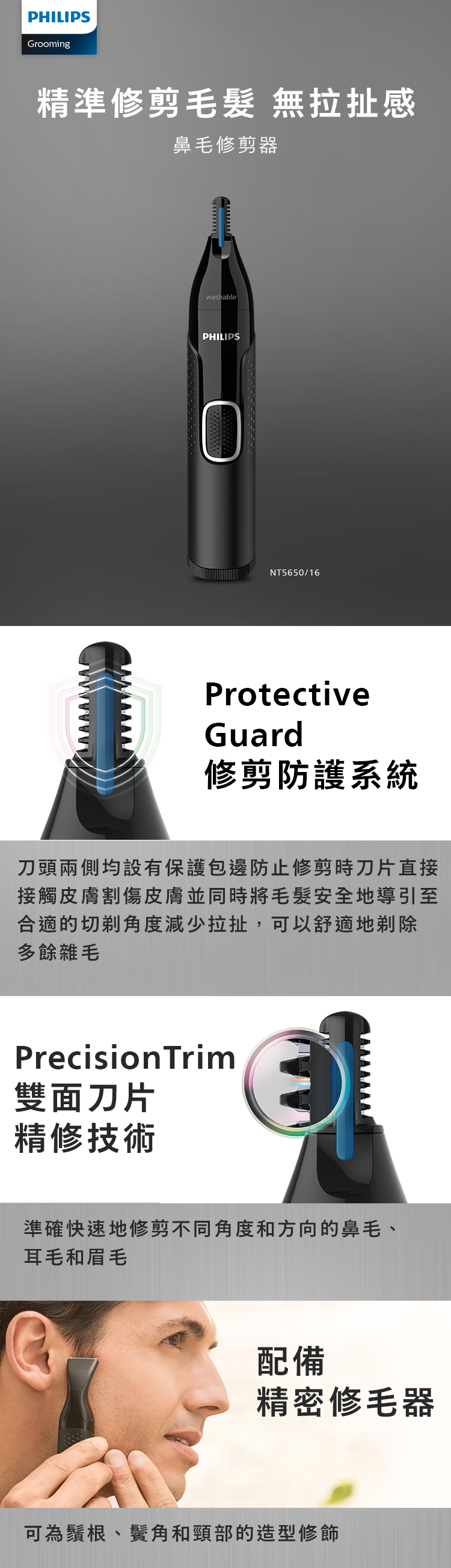 Philips 鼻毛修剪器 5000 系列可輕鬆修剪鼻毛、耳毛、眉毛和其他雜毛。全新的 PrecisionTrim 精準修剪技術和 Protective Guard 防護系統經過精心設計,可確保輕鬆有效修剪雜毛,而且不會產生拉扯感。