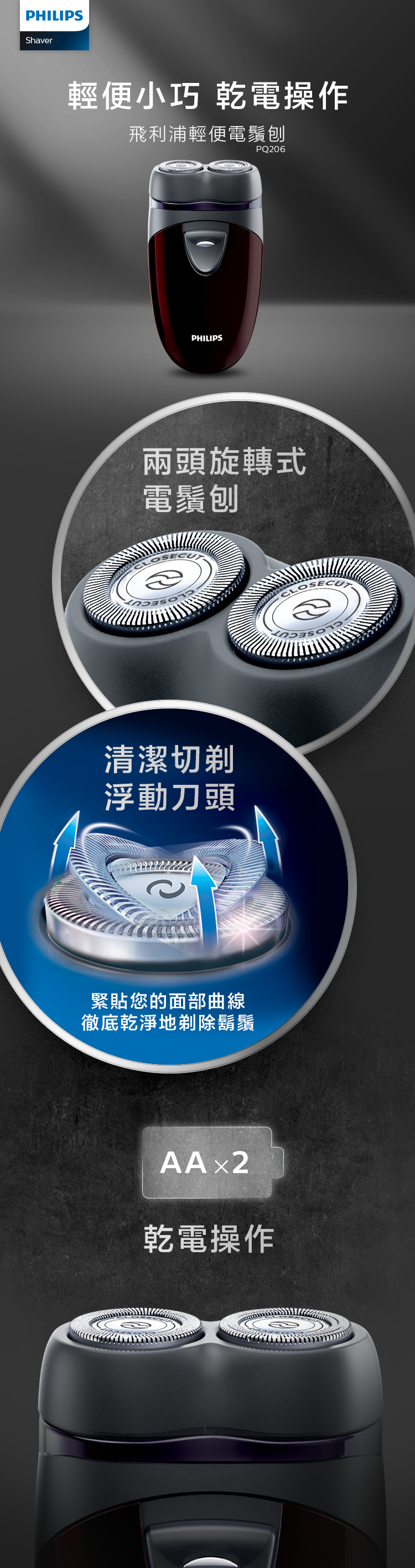 Philips PQ206 電鬚刨結合了貼面剃鬚系統與獨立浮動式刀頭,讓您每天看來自信有魅力 。