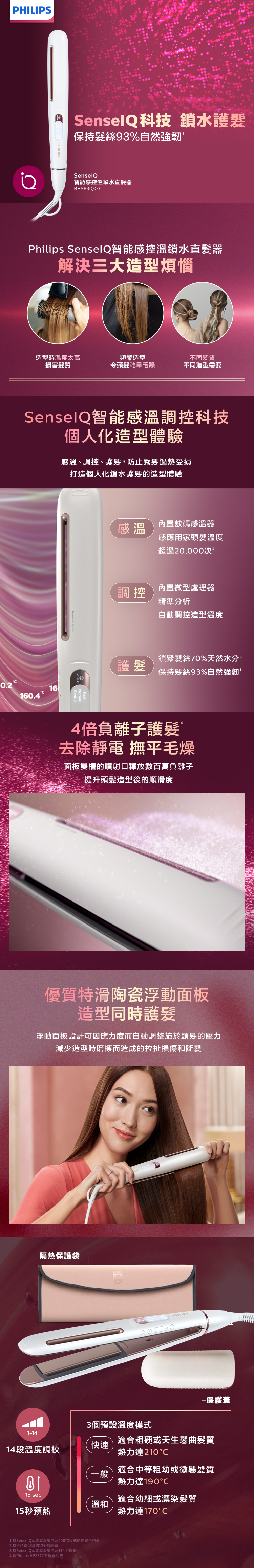 隆重介紹 Philips 個人化直髮器,配備 SenseIQ 智能感溫調控技術,專為鎖緊秀髮深層水分而設。直髮效果?每次造型時都能為您帶來強韌、健康且充滿光澤的秀髮。