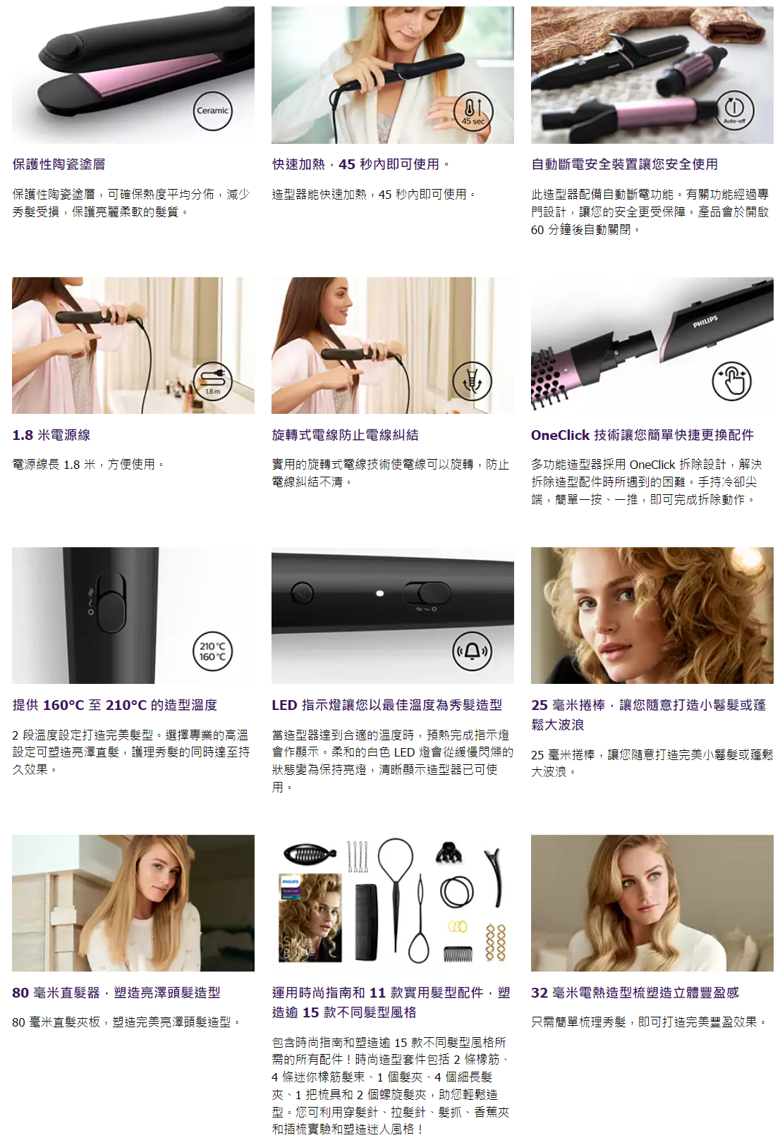 每天展現不同風格!整齊梳理、直髮、豐盈秀髮、鬈髮以至髮髻等等,配合時尚指南使用,以全新 Philips 多功能造型器打造逾 15 款髮型。