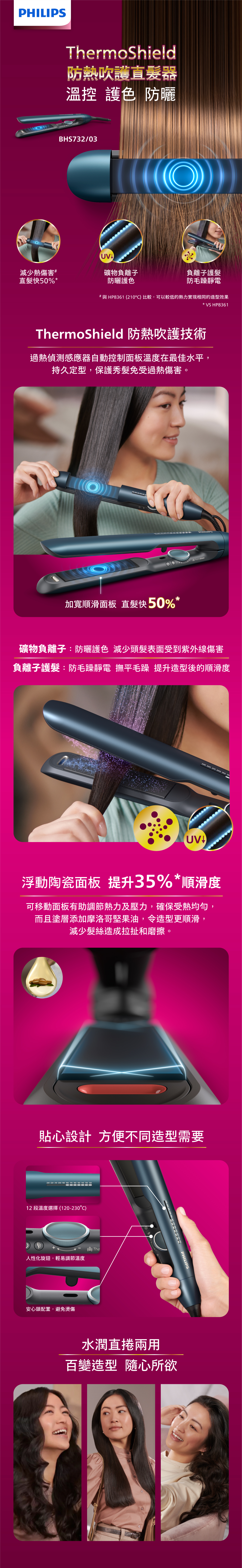 ThermoShield防熱吹護技術提供一致的溫度,減少高溫損害,礦物負離子減少紫外線的影響,讓您獲得保護的同時打造精美造型。適合打造美麗、健康及柔順的造型。